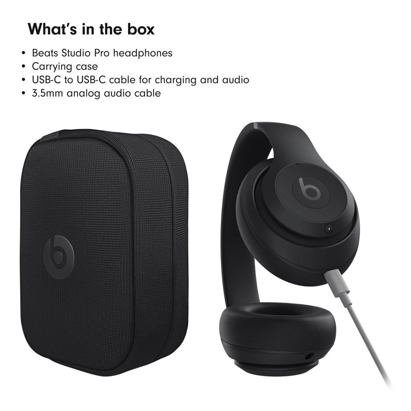 - WHAT'S IN THE BOX: Beats Studio Pro Wireless headphones, Woven carrying case, 3.5mm audio cable, Universal USB-C charging cable, Quick Start Guide, Warranty Card