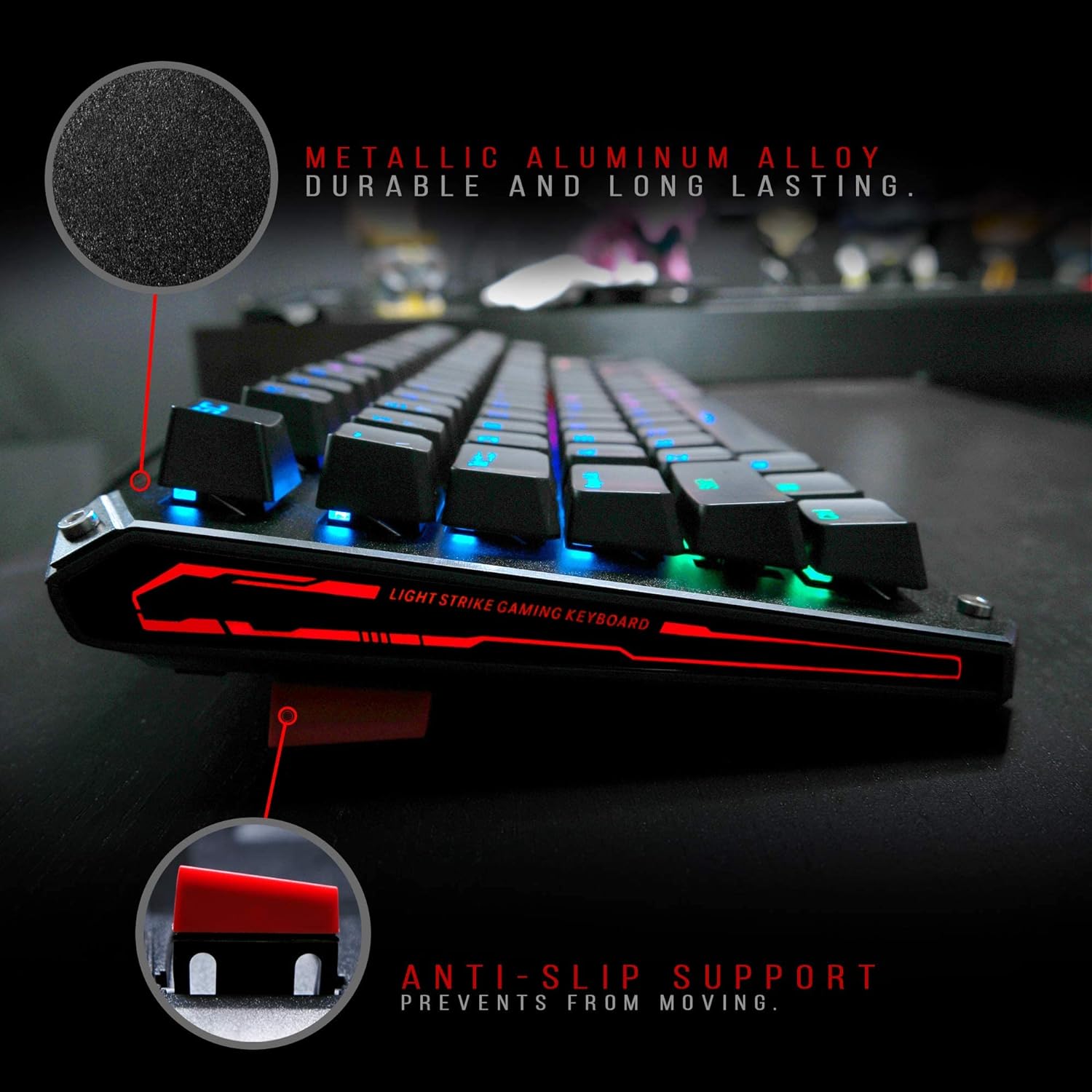- LIGHTNING FAST: Light strike technology gives you a true competitive edge with optical detection for keys that react at light speed. The continuous optical beam delivers zero-latency, with a 0.2ms response time versus the 30ms of mechanical. Each key is full NKRO and engineered with a calculated shallow stroke. This ensures each keypress can register simultaneously regardless of how many keys are pressed at a time, while also increasing active return rate and decreasing finger fatigue.