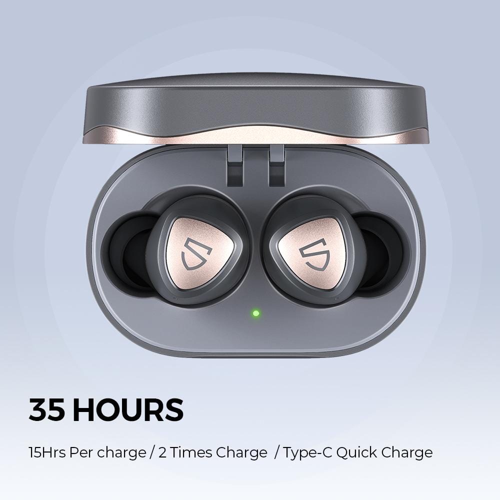 Taking with this SoundPEATS Sonic, you can enjoy music wherever you go as it offers up to 15 hours of playtime on a single full charge and a pocket-sized charging case extends playtime up to 35 hours, and it only takes 1.5 hrs to charge the case with type-C quick charge.